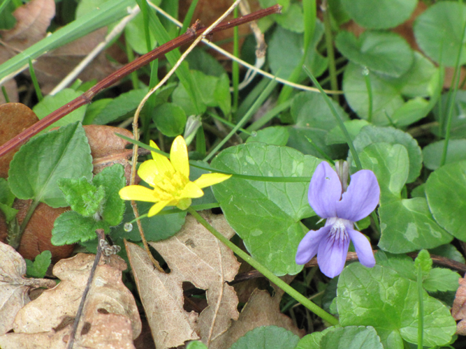 The Old and the New - a sweet violet and lesser celandine fight their way through last autumn's fallen oak leaves. Normoor Common April 2009.