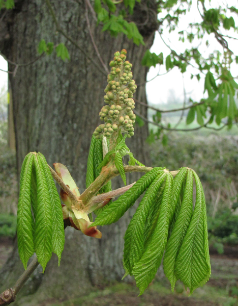 When the Horse Chestnut buds burst the flower buds and opening leaves look slightly reptilian, perhaps like a pteradactyl warming its wings in the sun. Normoor Common April 2009.